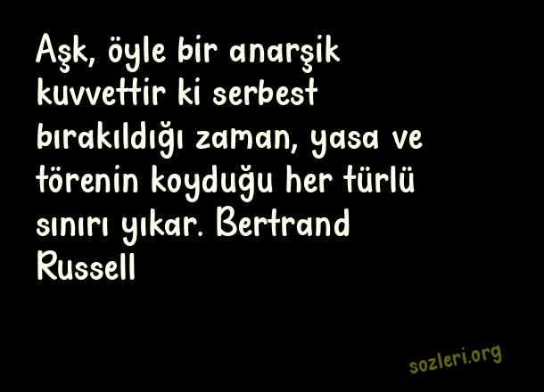 Aşk, öyle bir anarşik kuvvettir ki serbest bırakıldığı zaman, yasa ve törenin koyduğu her türlü sınırı yıkar. Bertrand Russell ( Aşk İle İlgili Güzel Sözler )