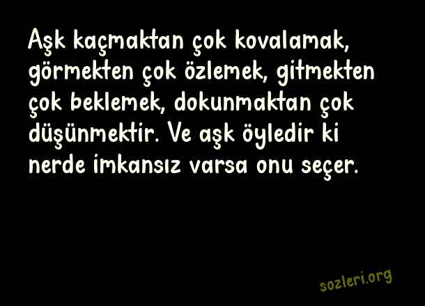 Aşk kaçmaktan çok kovalamak, görmekten çok özlemek, gitmekten çok beklemek, dokunmaktan çok düşünmektir. Ve aşk öyledir ki nerde imkansız varsa onu seçer. ( Aşk İtiraf )