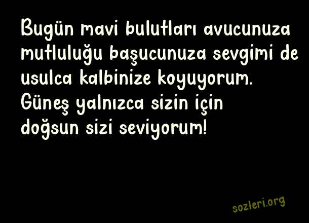 Bugün mavi bulutları avucunuza mutluluğu başucunuza sevgimi de usulca kalbinize koyuyorum. Güneş yalnızca sizin için doğsun sizi seviyorum! ( Aşk İtiraf )