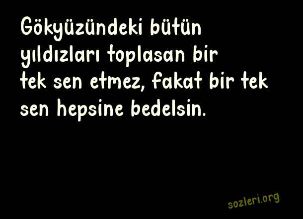 Gökyüzündeki bütün yıldızları toplasan bir tek sen etmez, fakat bir tek sen hepsine bedelsin. ( Aşk İtiraf )