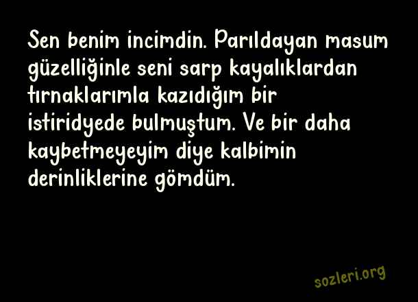 Sen benim incimdin. Parıldayan masum güzelliğinle seni sarp kayalıklardan tırnaklarımla kazıdığım bir istiridyede bulmuştum. Ve bir daha kaybetmeyeyim diye kalbimin derinliklerine gömdüm. ( Aşk İtiraf )