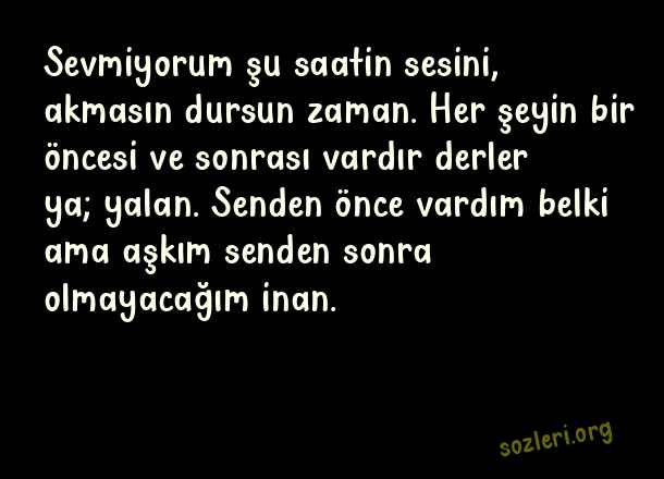 Sevmiyorum şu saatin sesini, akmasın dursun zaman. Her şeyin bir öncesi ve sonrası vardır derler ya; yalan. Senden önce vardım belki ama aşkım senden sonra olmayacağım inan. ( Aşk İtiraf )
