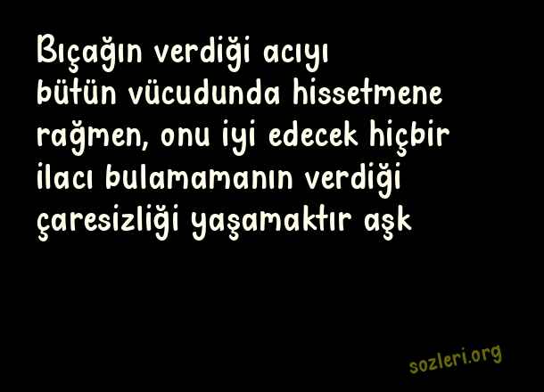 Bıçağın verdiği acıyı bütün vücudunda hissetmene rağmen, onu iyi edecek hiçbir ilacı bulamamanın verdiği çaresizliği yaşamaktır aşk… ( Aşk Nedir )