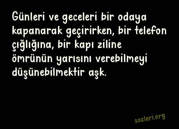 Günleri ve geceleri bir odaya kapanarak geçirirken, bir telefon çığlığına, bir kapı ziline ömrünün yarısını verebilmeyi düşünebilmektir aşk. ( Aşk Nedir )
