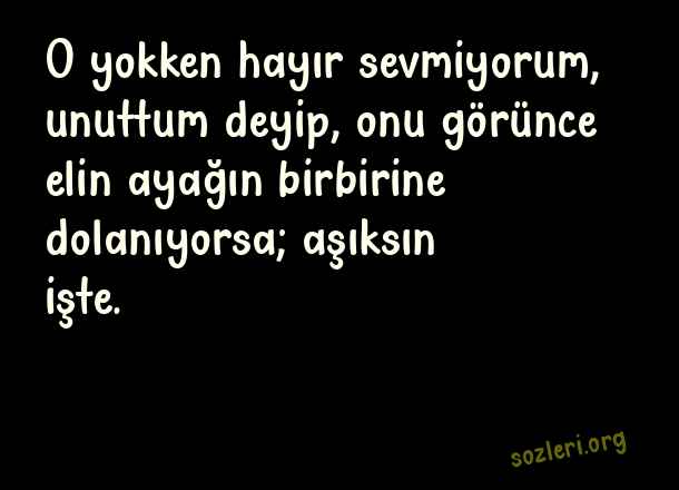 O yokken hayır sevmiyorum, unuttum deyip, onu görünce elin ayağın birbirine dolanıyorsa; aşıksın işte. ( Aşk Nedir )