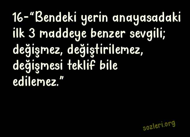 16-“Bendeki yerin anayasadaki ilk 3 maddeye benzer sevgili; değişmez, değiştirilemez, değişmesi teklif bile edilemez.” ( En Güzel 20 Aşk Sözü )