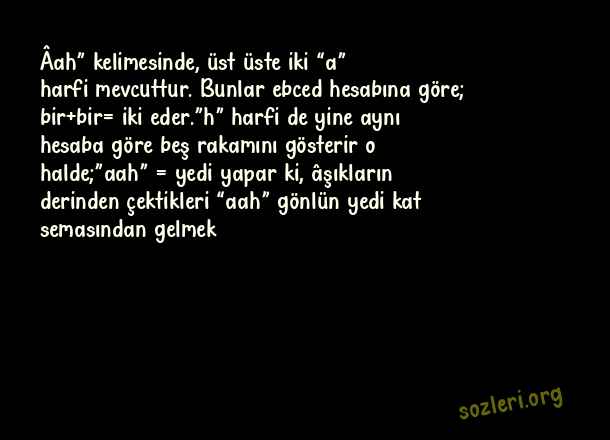 Âah” kelimesinde, üst üste iki “a” harfi mevcuttur. Bunlar ebced hesabına göre; bir+bir= iki eder.”h” harfi de yine aynı hesaba göre beş rakamını gösterir o halde;”aah” = yedi yapar ki, âşıkların derinden çektikleri “aah” gönlün yedi kat semasından gelmek ( İlahi Aşk )