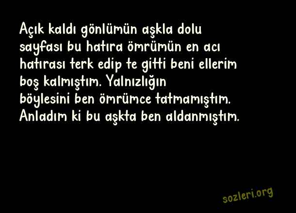 Açık kaldı gönlümün aşkla dolu sayfası bu hatıra ömrümün en acı hatırası terk edip te gitti beni ellerim boş kalmıştım. Yalnızlığın böylesini ben ömrümce tatmamıştım. Anladım ki bu aşkta ben aldanmıştım. ( Arabesk Aşk )