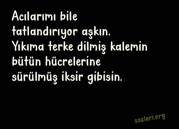 Acılarımı bile tatlandırıyor aşkın. Yıkıma terke dilmiş kalemin bütün hücrelerine sürülmüş iksir gibisin. ( En İyi 50 Aşk Sözü )