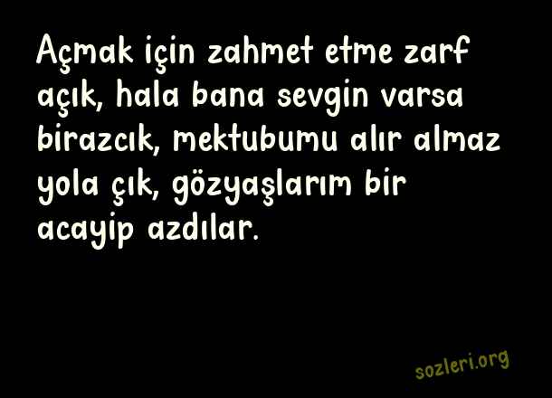 Açmak için zahmet etme zarf açık, hala bana sevgin varsa birazcık, mektubumu alır almaz yola çık, gözyaşlarım bir acayip azdılar. ( Arabesk Aşk )