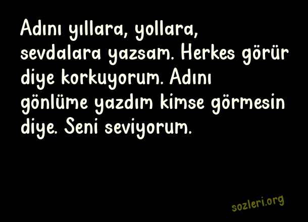 Adını yıllara, yollara, sevdalara yazsam. Herkes görür diye korkuyorum. Adını gönlüme yazdım kimse görmesin diye. Seni seviyorum. ( Tumblr Aşk )