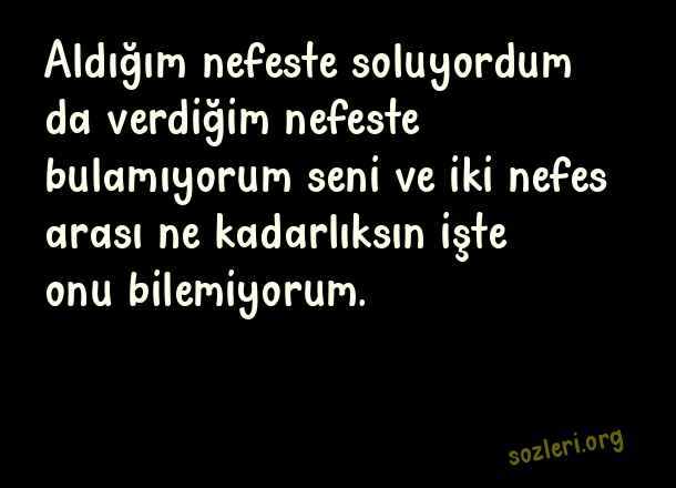 Aldığım nefeste soluyordum da verdiğim nefeste bulamıyorum seni ve iki nefes arası ne kadarlıksın işte onu bilemiyorum. ( Bitmiş Aşk )
