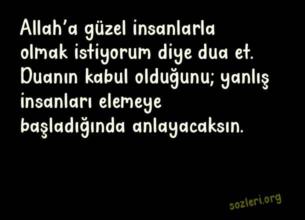 Allah’a güzel insanlarla olmak istiyorum diye dua et. Duanın kabul olduğunu; yanlış insanları elemeye başladığında anlayacaksın. ( Aşkım Kapışmak )
