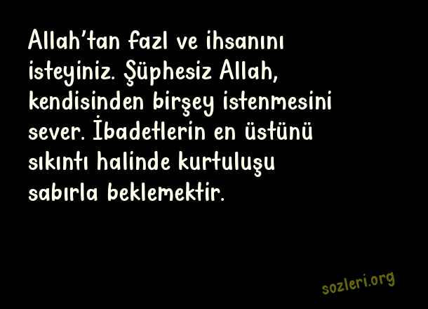 Allah’tan fazl ve ihsanını isteyiniz. Şüphesiz Allah, kendisinden birşey istenmesini sever. İbadetlerin en üstünü sıkıntı halinde kurtuluşu sabırla beklemektir. ( Allah Aşkı )