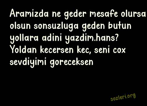 Aramizda ne geder mesafe olursa olsun sonsuzluga geden butun yollara adini yazdim.hans? Yoldan kecersen kec, seni cox sevdiyimi goreceksen ( Azerice Aşk )
