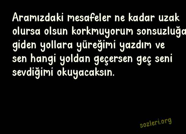 Aramızdaki mesafeler ne kadar uzak olursa olsun korkmuyorum sonsuzluğa giden yollara yüreğimi yazdım ve sen hangi yoldan geçersen geç seni sevdiğimi okuyacaksın. ( Duygusal Aşk )