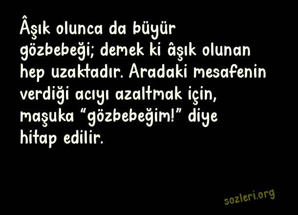 Âşık olunca da büyür gözbebeği; demek ki âşık olunan hep uzaktadır. Aradaki mesafenin verdiği acıyı azaltmak için, maşuka “gözbebeğim!” diye hitap edilir. ( Aşka Dair Sözler )