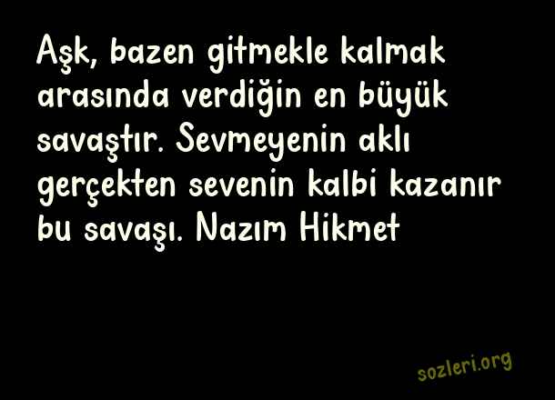 Aşk, bazen gitmekle kalmak arasında verdiğin en büyük savaştır. Sevmeyenin aklı gerçekten sevenin kalbi kazanır bu savaşı. Nazım Hikmet ( Aşkı Anlatan Sözler )