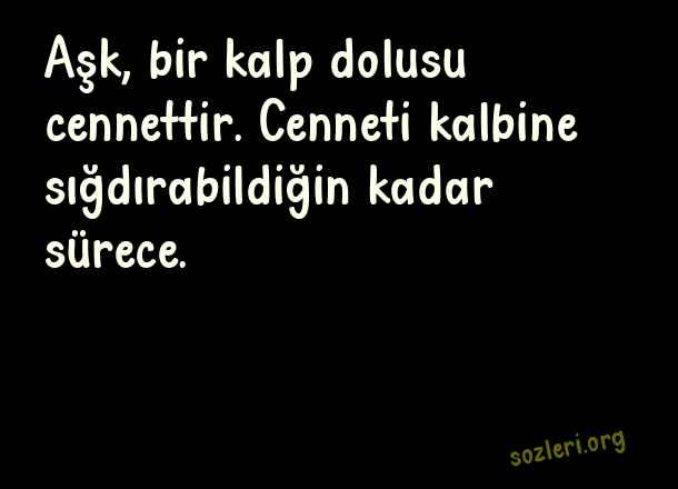 Aşk, bir kalp dolusu cennettir. Cenneti kalbine sığdırabildiğin kadar sürece. ( Aşka Dair Güzel Sözler )
