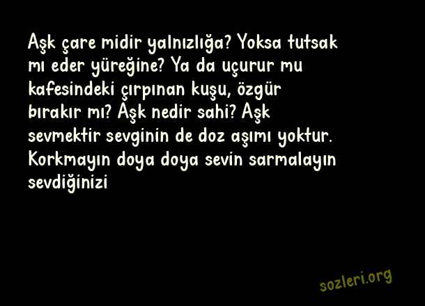 Aşk çare midir yalnızlığa? Yoksa tutsak mı eder yüreğine? Ya da uçurur mu kafesindeki çırpınan kuşu, özgür bırakır mı? Aşk nedir sahi? Aşk sevmektir sevginin de doz aşımı yoktur. Korkmayın doya doya sevin sarmalayın sevdiğinizi… ( Aşk )