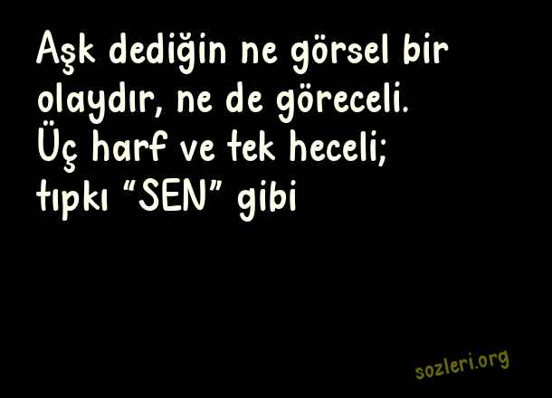Aşk dediğin ne görsel bir olaydır, ne de göreceli. Üç harf ve tek heceli; tıpkı “SEN” gibi… ( Aşka Dair Sözler )