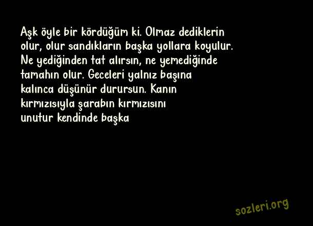 Aşk öyle bir kördüğüm ki. Olmaz dediklerin olur, olur sandıkların başka yollara koyulur. Ne yediğinden tat alırsın, ne yemediğinde tamahın olur. Geceleri yalnız başına kalınca düşünür durursun. Kanın kırmızısıyla şarabın kırmızısını unutur kendinde başka ( Aşk Dolu Mesajlar )