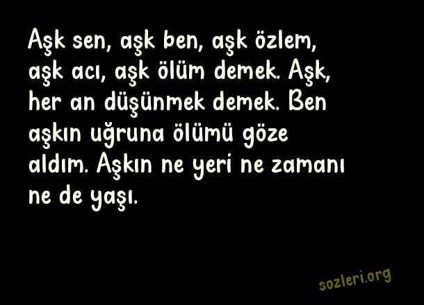 Aşk sen, aşk ben, aşk özlem, aşk acı, aşk ölüm demek. Aşk, her an düşünmek demek. Ben aşkın uğruna ölümü göze aldım. Aşkın ne yeri ne zamanı ne de yaşı. ( Aşk Dolu Mesajlar )