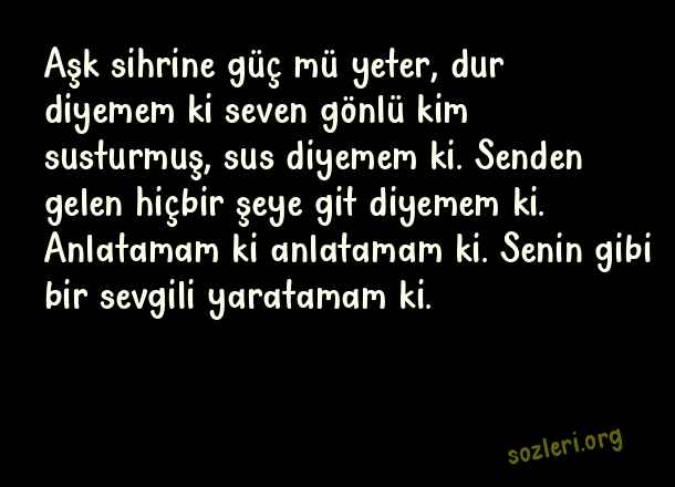 Aşk sihrine güç mü yeter, dur diyemem ki seven gönlü kim susturmuş, sus diyemem ki. Senden gelen hiçbir şeye git diyemem ki. Anlatamam ki anlatamam ki. Senin gibi bir sevgili yaratamam ki. ( Arabesk Aşk )