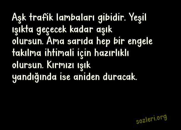 Aşk trafik lambaları gibidir. Yeşil ışıkta geçecek kadar aşık olursun. Ama sarıda hep bir engele takılma ihtimali için hazırlıklı olursun. Kırmızı ışık yandığında ise aniden duracak. ( Aşk Dolu Mesajlar )