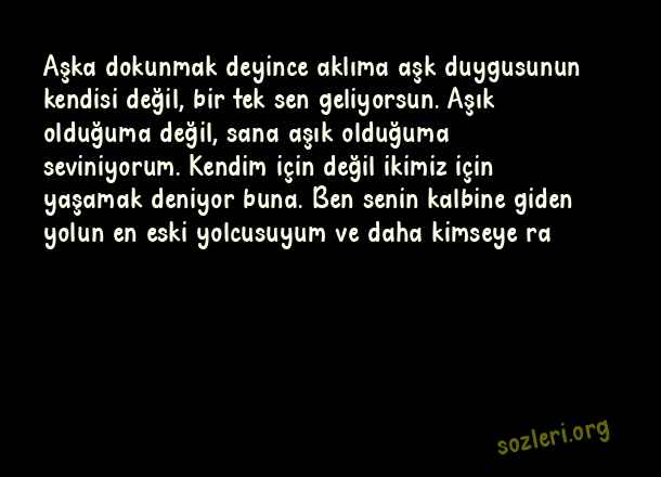 Aşka dokunmak deyince aklıma aşk duygusunun kendisi değil, bir tek sen geliyorsun. Aşık olduğuma değil, sana aşık olduğuma seviniyorum. Kendim için değil ikimiz için yaşamak deniyor buna. Ben senin kalbine giden yolun en eski yolcusuyum ve daha kimseye ra ( Aşk Sayfası )
