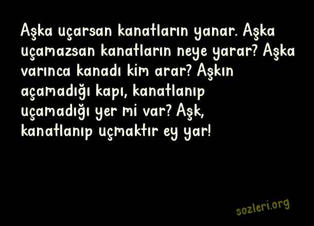Aşka uçarsan kanatların yanar. Aşka uçamazsan kanatların neye yarar? Aşka varınca kanadı kim arar? Aşkın açamadığı kapı, kanatlanıp uçamadığı yer mi var? Aşk, kanatlanıp uçmaktır ey yar! ( Harika Aşk )