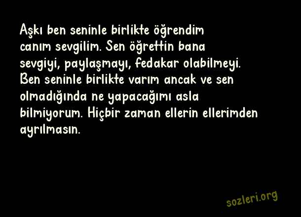 Aşkı ben seninle birlikte öğrendim canım sevgilim. Sen öğrettin bana sevgiyi, paylaşmayı, fedakar olabilmeyi. Ben seninle birlikte varım ancak ve sen olmadığında ne yapacağımı asla bilmiyorum. Hiçbir zaman ellerin ellerimden ayrılmasın. ( Sevgiliye Yazılacak Aşk )