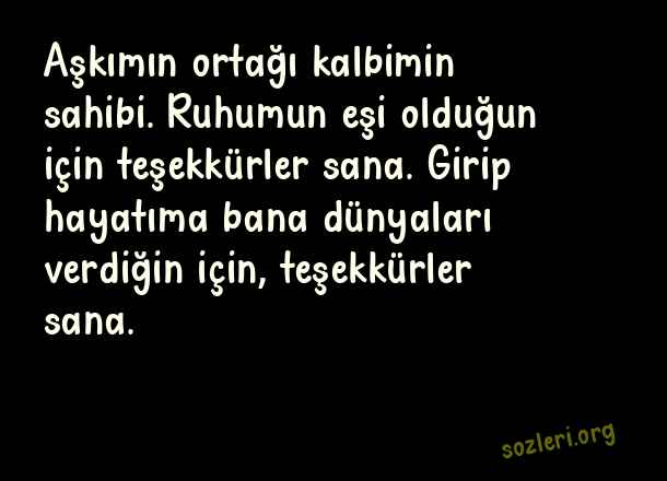 Aşkımın ortağı kalbimin sahibi. Ruhumun eşi olduğun için teşekkürler sana. Girip hayatıma bana dünyaları verdiğin için, teşekkürler sana. ( Eşe Aşk )