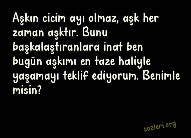 Aşkın cicim ayı olmaz, aşk her zaman aşktır. Bunu başkalaştıranlara inat ben bugün aşkımı en taze haliyle yaşamayı teklif ediyorum. Benimle misin? ( Aşk Dolu Mesajlar )