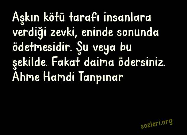 Aşkın kötü tarafı insanlara verdiği zevki, eninde sonunda ödetmesidir. Şu veya bu şekilde. Fakat daima ödersiniz. Ahme Hamdi Tanpınar ( Yazarlardan Aşk )