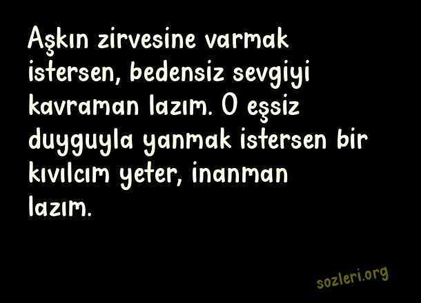 Aşkın zirvesine varmak istersen, bedensiz sevgiyi kavraman lazım. O eşsiz duyguyla yanmak istersen bir kıvılcım yeter, inanman lazım. ( Arabesk Aşk )
