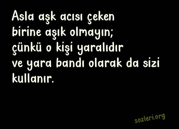 Asla aşk acısı çeken birine aşık olmayın; çünkü o kişi yaralıdır ve yara bandı olarak da sizi kullanır. ( En Güzel Aşk )