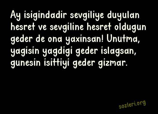 Ay isigindadir sevgiliye duyulan hesret ve sevgiline hesret oldugun geder de ona yaxinsan! Unutma, yagisin yagdigi geder islagsan, gunesin isittiyi geder gizmar. ( Azerice Aşk )