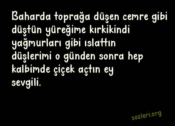Baharda toprağa düşen cemre gibi düştün yüreğime kırkikindi yağmurları gibi ıslattın düşlerimi o günden sonra hep kalbimde çiçek açtın ey sevgili. ( Aşk )