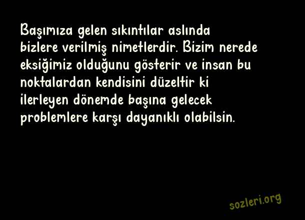 Başımıza gelen sıkıntılar aslında bizlere verilmiş nimetlerdir. Bizim nerede eksiğimiz olduğunu gösterir ve insan bu noktalardan kendisini düzeltir ki ilerleyen dönemde başına gelecek problemlere karşı dayanıklı olabilsin. ( Aşkım Kapışmak )