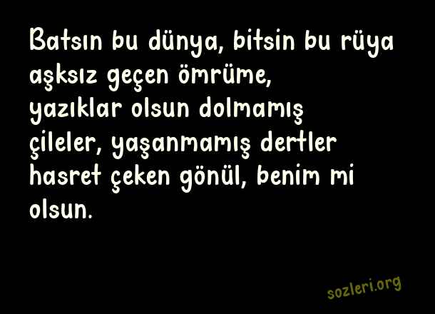 Batsın bu dünya, bitsin bu rüya aşksız geçen ömrüme, yazıklar olsun dolmamış çileler, yaşanmamış dertler hasret çeken gönül, benim mi olsun. ( Arabesk Aşk )