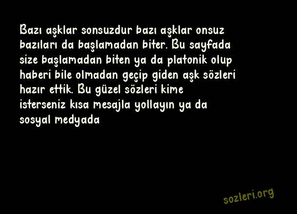 Bazı aşklar sonsuzdur bazı aşklar onsuz bazıları da başlamadan biter. Bu sayfada size başlamadan biten ya da platonik olup haberi bile olmadan geçip giden aşk sözleri hazır ettik. Bu güzel sözleri kime isterseniz kısa mesajla yollayın ya da sosyal medyada ( Başlamadan Biten Aşk )