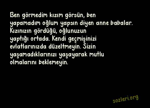 Ben görmedim kızım görsün, ben yapamadım oğlum yapsın diyen anne babalar. Kızınızın gördüğü, oğlunuzun yaptığı ortada. Kendi geçmişinizi evlatlarınızda düzeltmeyin. Sizin yaşamadıklarınızı yaşayarak mutlu olmalarını beklemeyin. ( Aşkım Kapışmak )