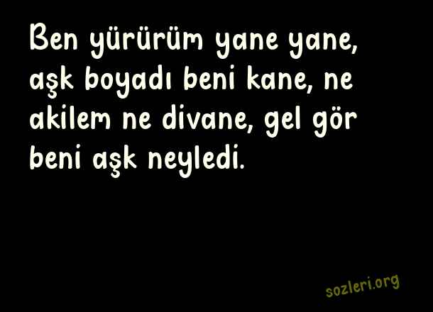 Ben yürürüm yane yane, aşk boyadı beni kane, ne akilem ne divane, gel gör beni aşk neyledi. ( Harika Aşk )