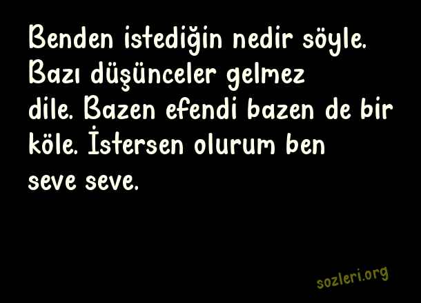 Benden istediğin nedir söyle. Bazı düşünceler gelmez dile. Bazen efendi bazen de bir köle. İstersen olurum ben seve seve. ( Arabesk Aşk )