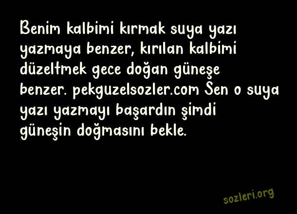 Benim kalbimi kırmak suya yazı yazmaya benzer, kırılan kalbimi düzeltmek gece doğan güneşe benzer. Sen o suya yazı yazmayı başardın şimdi güneşin doğmasını bekle. ( Sitemli Aşk )