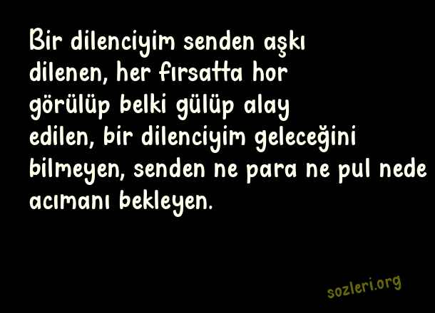 Bir dilenciyim senden aşkı dilenen, her fırsatta hor görülüp belki gülüp alay edilen, bir dilenciyim geleceğini bilmeyen, senden ne para ne pul nede acımanı bekleyen. ( Arabesk Aşk )