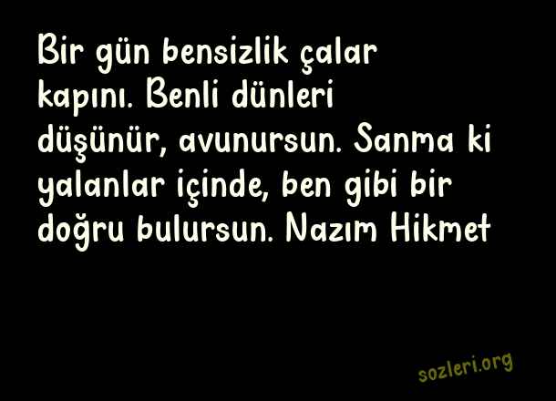 Bir gün bensizlik çalar kapını. Benli dünleri düşünür, avunursun. Sanma ki yalanlar içinde, ben gibi bir doğru bulursun. Nazım Hikmet ( Başlamadan Biten Aşk )