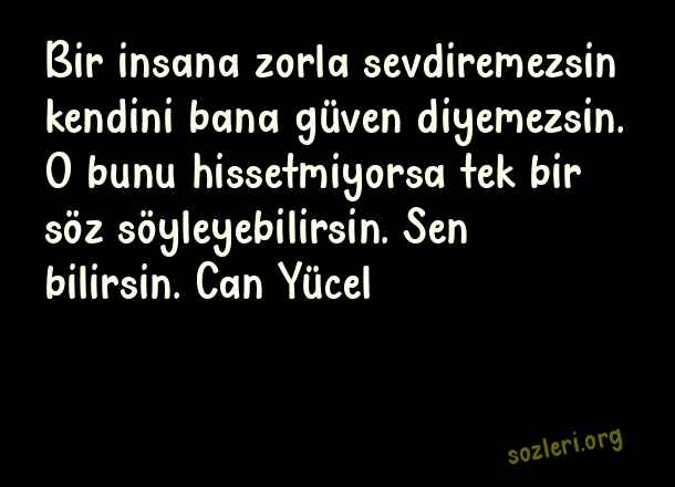 Bir insana zorla sevdiremezsin kendini bana güven diyemezsin. O bunu hissetmiyorsa tek bir söz söyleyebilirsin. Sen bilirsin. Can Yücel ( Bitmiş Aşk )