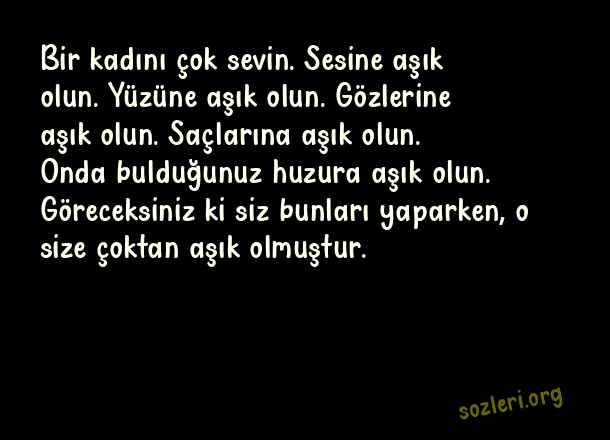 Bir kadını çok sevin. Sesine aşık olun. Yüzüne aşık olun. Gözlerine aşık olun. Saçlarına aşık olun. Onda bulduğunuz huzura aşık olun. Göreceksiniz ki siz bunları yaparken, o size çoktan aşık olmuştur. ( En Güzel Aşk Dolu Sözler 2023 )